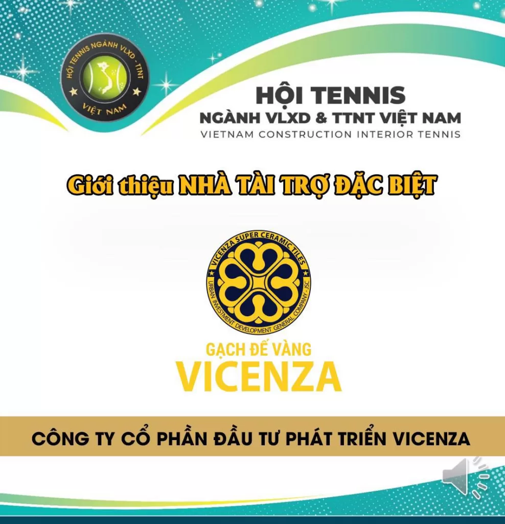 Giải Tennis ngành Vật liệu xây dựng – Trang Trí nội thất Việt Nam MỪNG XUÂN 2024 hân hạnh được đồng hành cùng VICENZA VIỆT NAM với vai trò là Nhà Tài trợ Đặc biệt. Ban tổ chức xin trân trọng cảm ơn sự đóng góp của Quý công ty dành cho giải đấu. Giải đấu sẽ được diễn ra vào ngày 8, 9, 10 tháng 3 năm 2024.